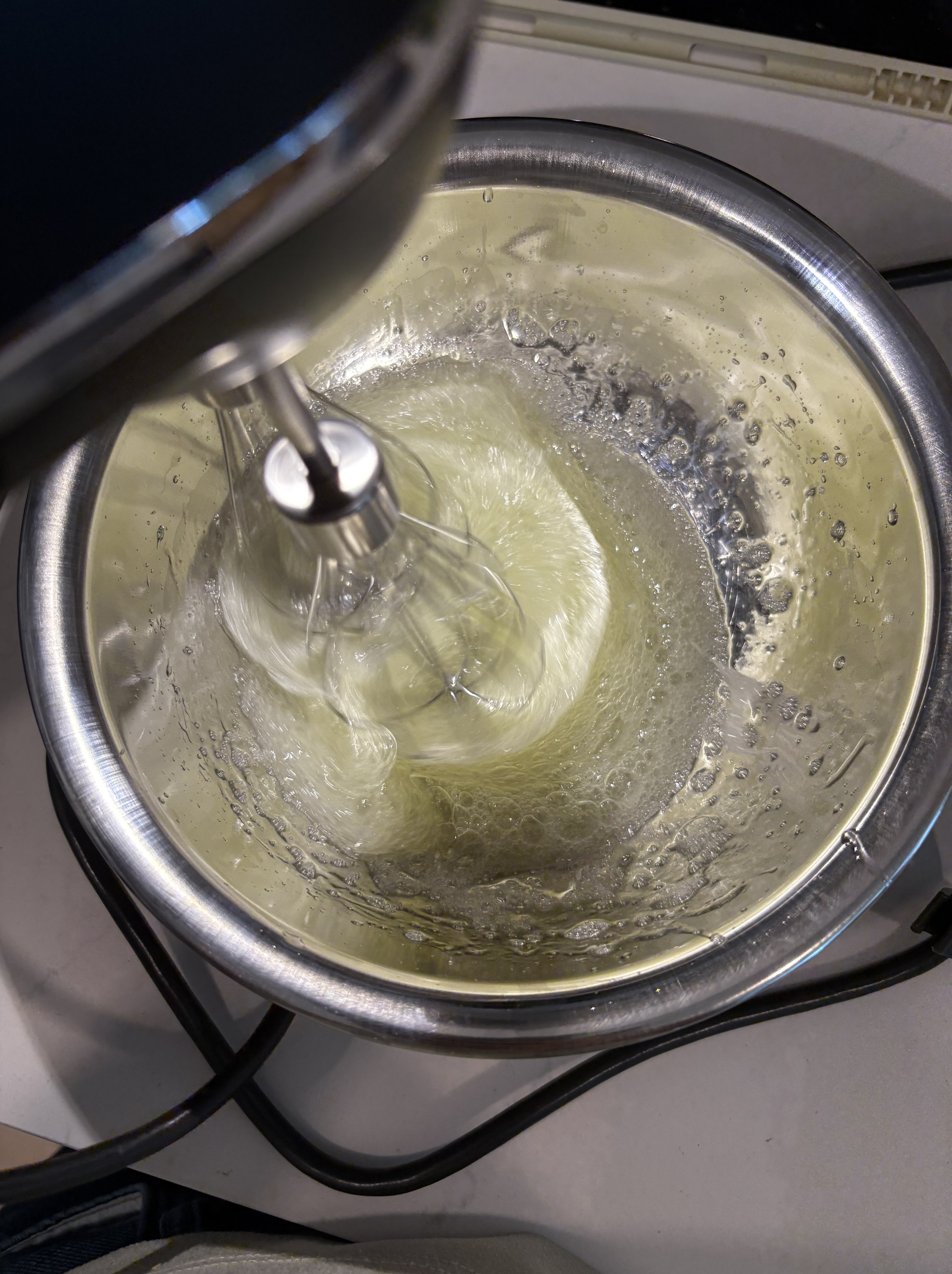 4. Take the meringue bowl off the saucepan and switch to mixing with an electric mixer. You can beat it on med-high but be careful of accidentally spraying meringue. You want to beat until your meringue cools down to room temperature and you reach stiff peaks. (Note: with a hand mixer this will take a while)