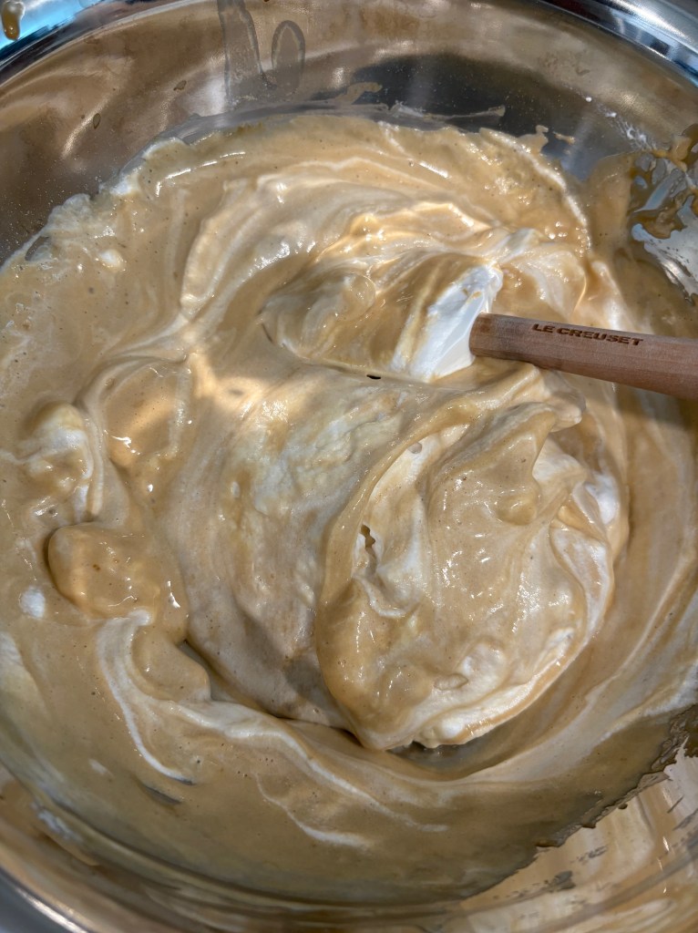 8. Use a spatula to take about a 1/3 chunk of the meringue and incorporate it into the cake batter to lighten the batter. Then scrape the rest of your meringue into the batter and gently fold until just well incorporated. Be soft with it to not deflate the air bubbles.