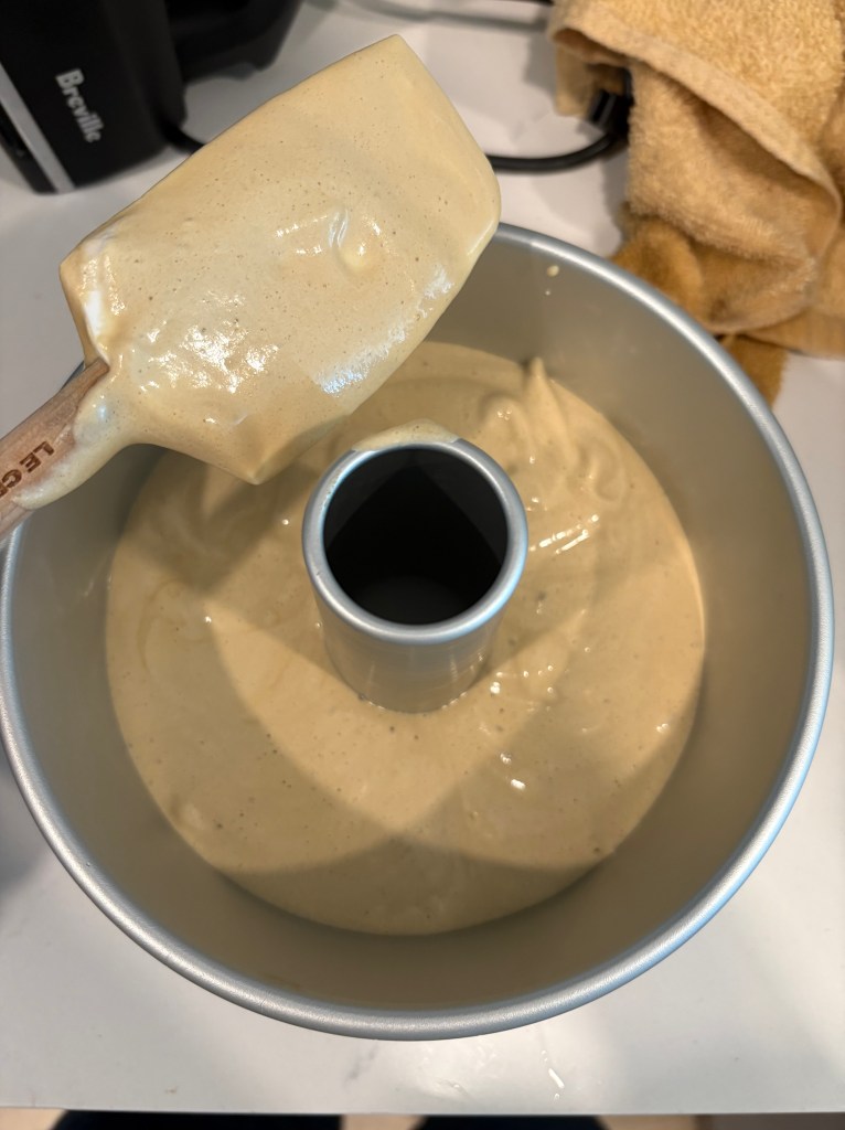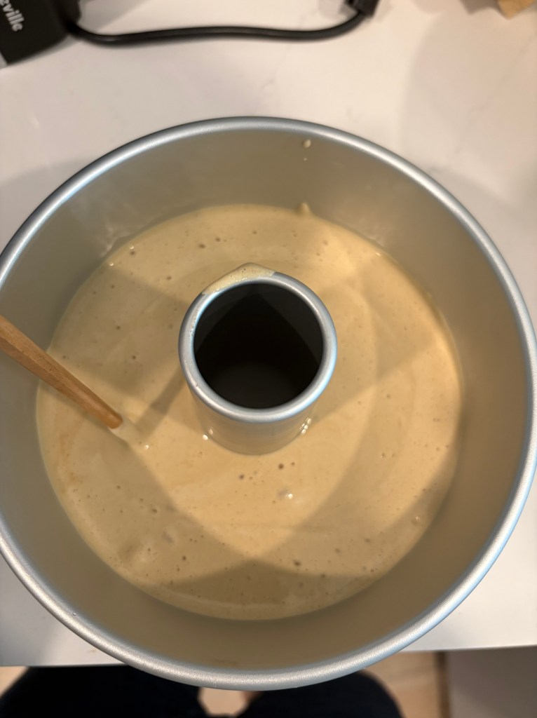 9. Pour the batter into the chiffon pan (do not grease). Jiggle the pan a bit to get it even, and you can even run a chopstick through it to pop air bubbles inside.