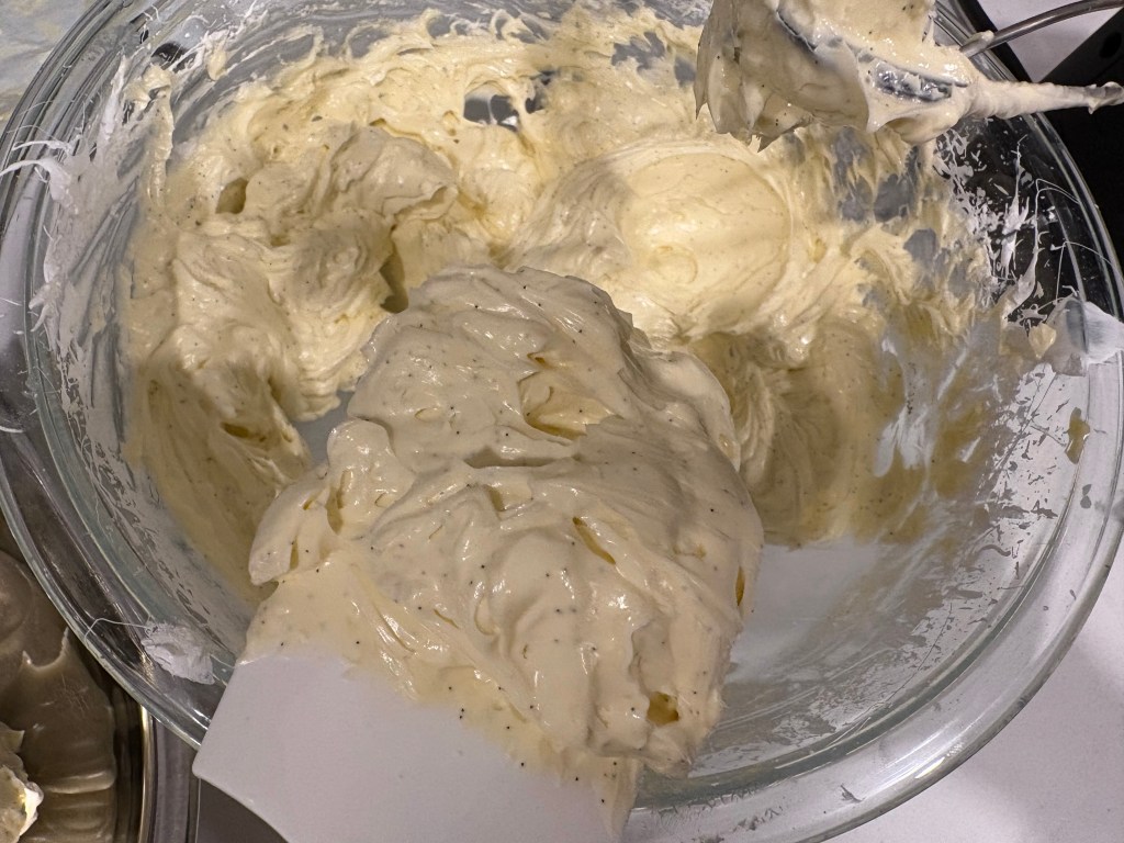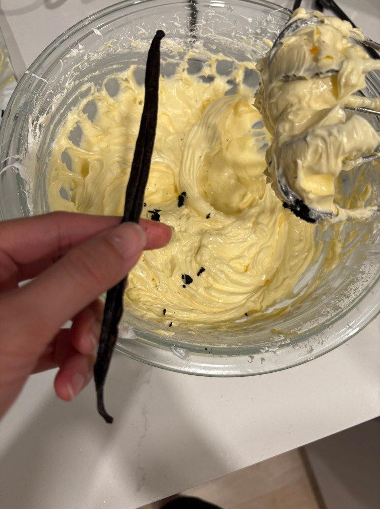 6. Open and scrape out the contents of one vanilla bean pod into the buttercream and mix in thoroughly. It should now be speckled, but still a cream color.