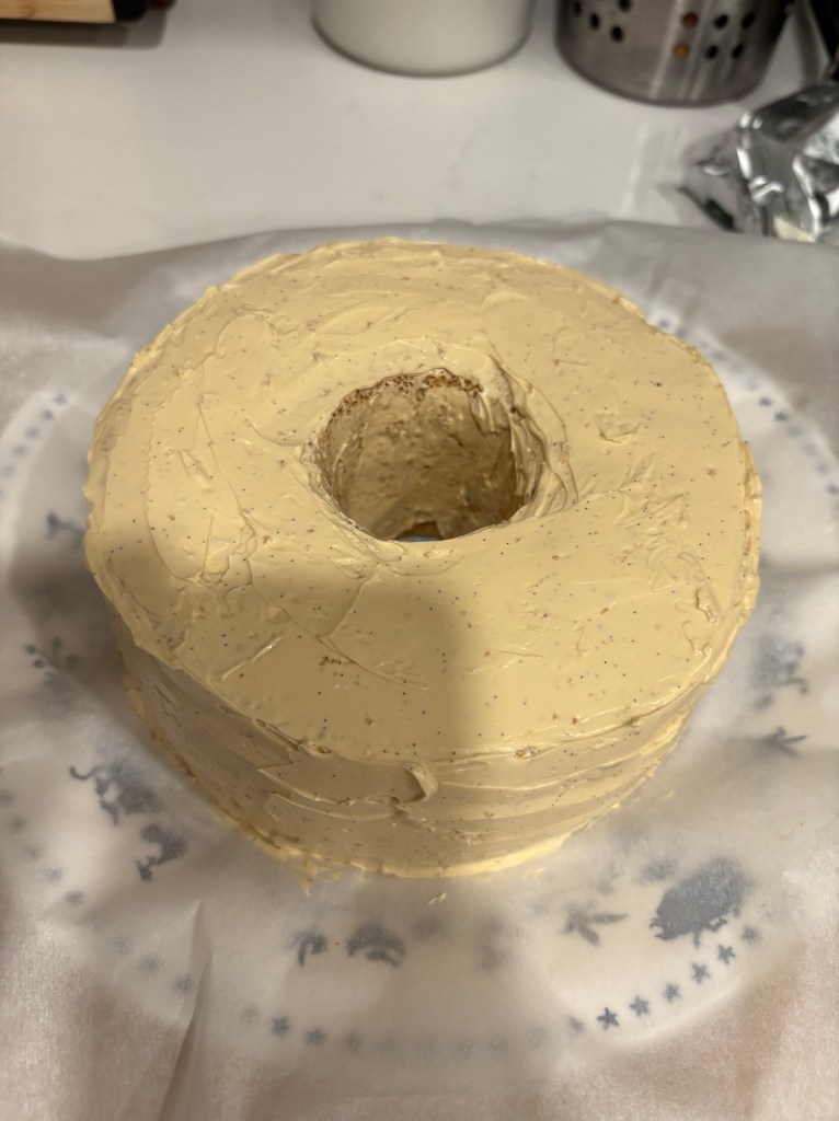 In brief, the cake I was making was a coffee chiffon cake frosted with coffee Swiss meringue buttercream and decorated with Swiss meringue buttercream seashells.