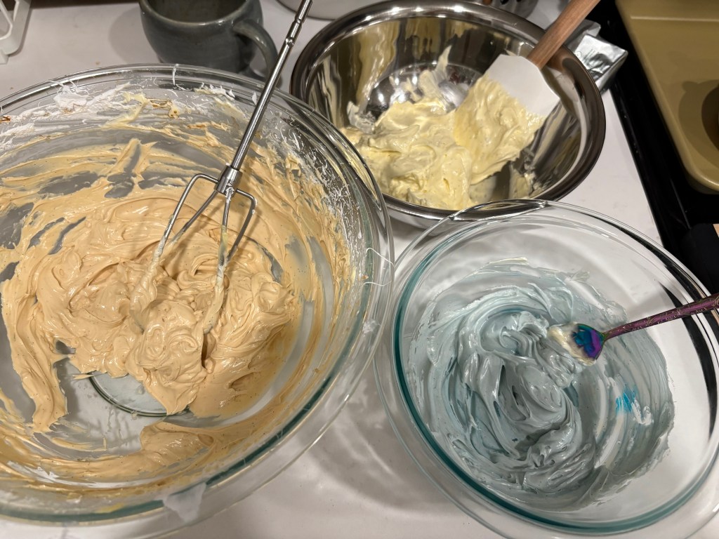 - I used the base vanilla buttercream (for white/ cream), coffee buttercream (for brown), and blue food coloring, and extra liquid espresso + cocoa powder to create some more details