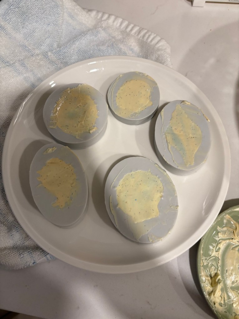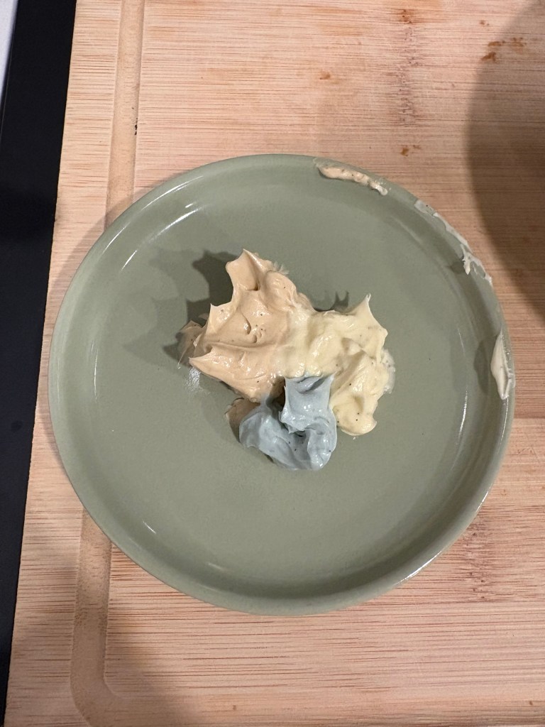 2. To make the shells, put some globs of each buttercream in different proportions onto a small dish and marble them with a chopstick.
