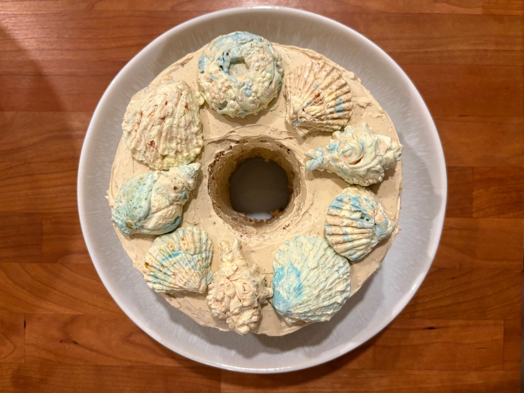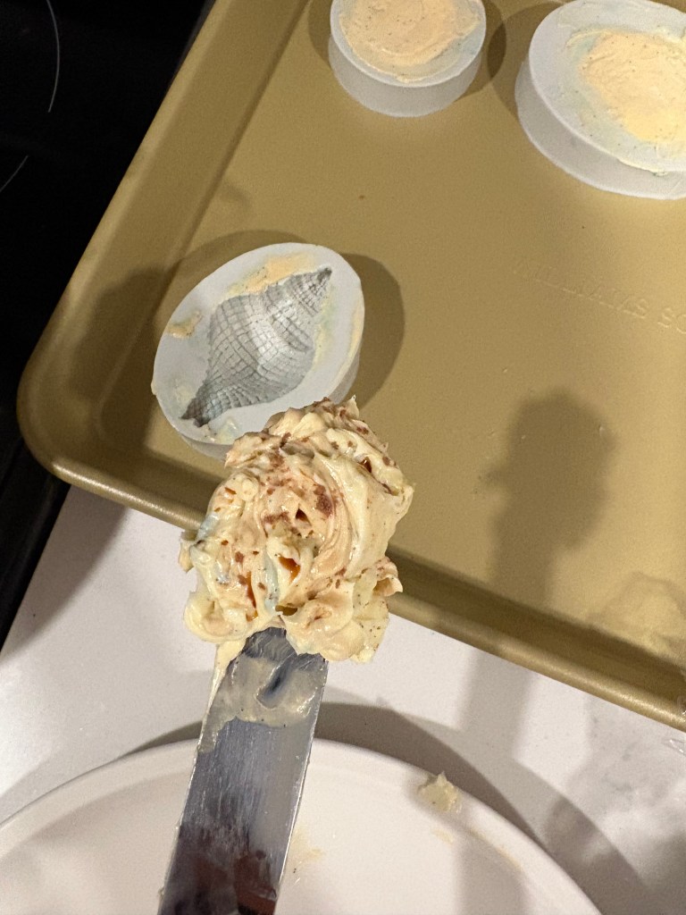 I was inspired for this part by something I found when planning a summer bbq with friends menu. When looking into compound butter ideas, I stumbled across this very aesthetic recipe from Rosanna Etc. for seashell compound butter. I went ahead and bought the exact same seashell silicone molds, and thought: hey, if it works with butter, maybe it’ll work with buttercream in a similar way.
