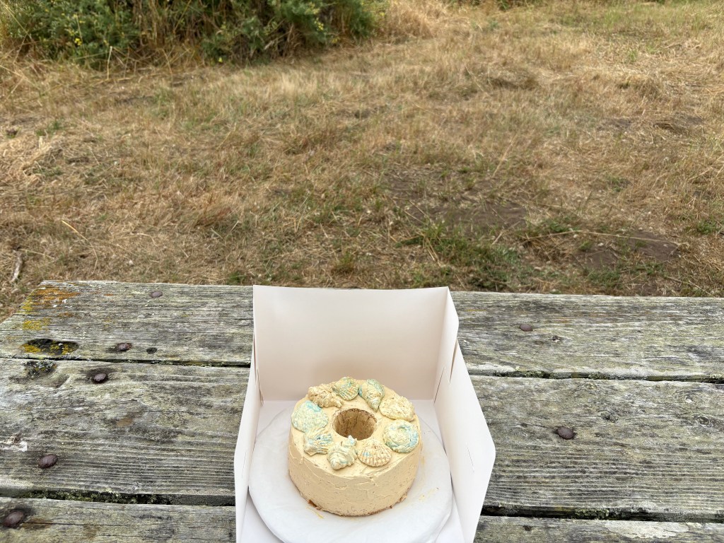 My cake needed to be able to survive a 1hr 30min drive to the Point Reyes Picnic Area and another hour or so outdoor picnic. Thankfully, Point Reyes itself generally has cool, though windy weather, so even though it was summer, I could get away with the cake not melting. (Fun fact: According to this SF Gate article, this 2025 Bay Area summer is actually one of the coldest in decades.)